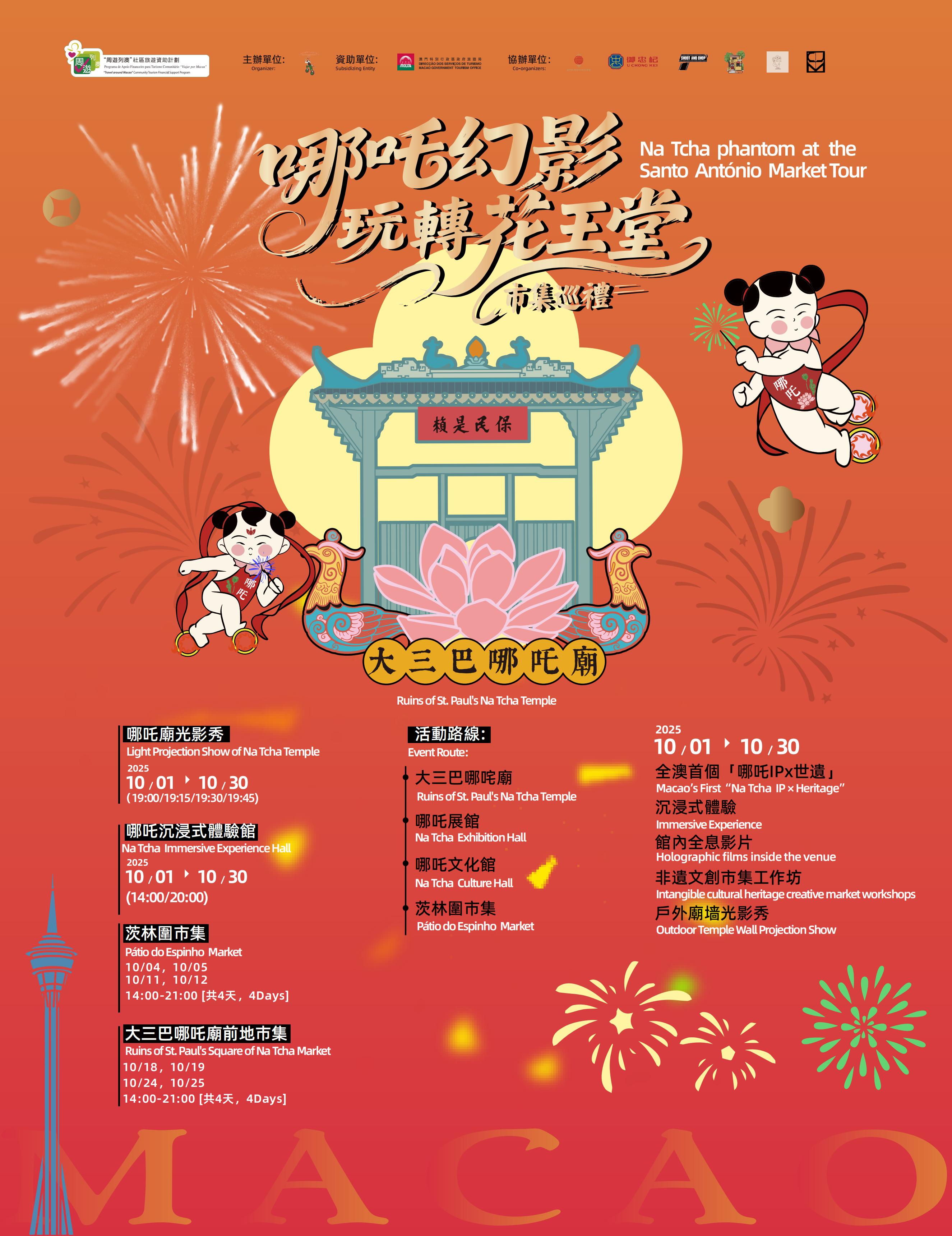 大三巴哪咤廟外牆於十月的每晚上演震撼視覺光影秀,哪吒沉浸式體驗館更每日開放兩場「哪吒誕」氛圍光影體驗,讓入場人士深入感受澳門非物質文化遺產哪吒信俗的魅力。除此之外,十月每個週末更會在花王堂區兩個不同地點設文創市集,集結本地手作、傳統美食及哪吒主題文創產品,適合親子同樂和文化探索。